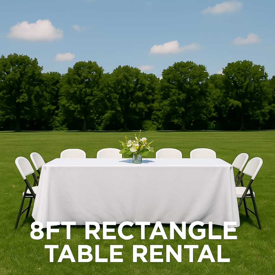 Looking for a versatile and spacious table to elevate your event or workspace? or maybe to pair with one of our tent rentals Our main service 8ft Folding Rectangle Table in Northwest Arkansas, The River Valley, and Eastern Oklahoma is the perfect solution! Whether you’re planning a family gathering, corporate event, wedding, or community meeting, this table blends convenience, functionality, and modern design. Needing chairs as well? We have you covered with our white folding chair rental.